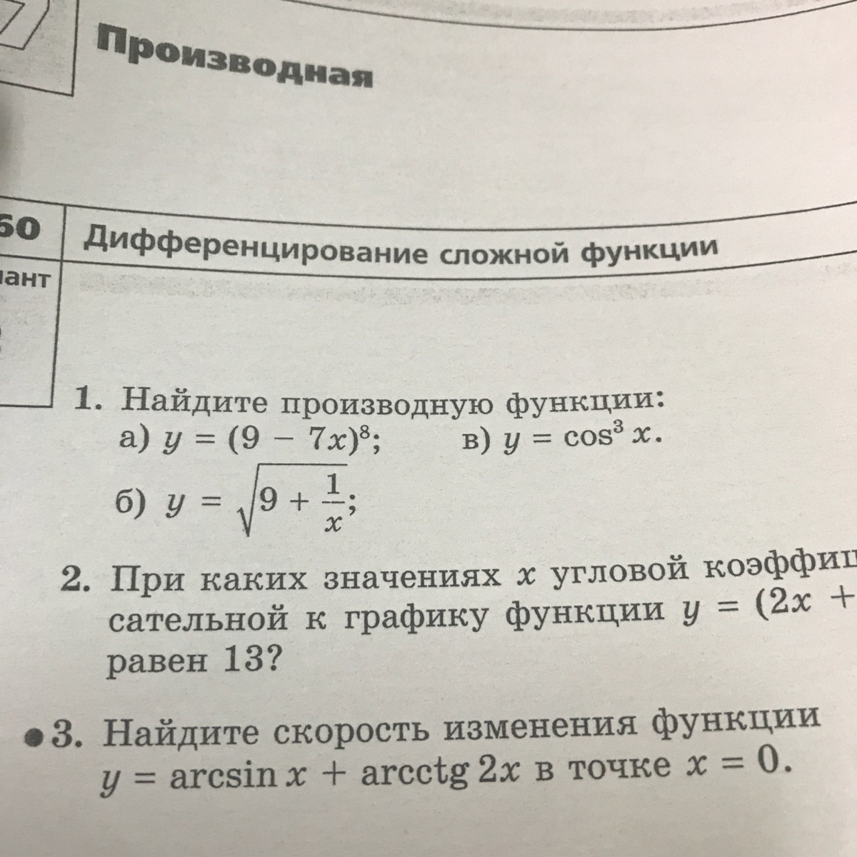 a); ; y=(9-7x)^8\\y'=8cdot (9-7x)^7cdot (9-7x)'=8cdot (9-7x)^7cdot (-7)=\\=-56cdot (9-7x)^7\\b); ; y=cos^3x=(cosx)^3\\y'=3cdot  (cosx)^2cdot (cosx)'=3cdot cos^2xcdot (-sinx)=-3cdot cos^2xcdot sinx\\c); ; y= sqrt{9+frac{1}{x}} \\y'=frac{1}{2sqrt{9+frac{1}{x}}}cdot (9+frac{1}{x})'=frac{1}{2sqrt{9+frac{1}{x}}}cdot frac{-1}{x^2}=-frac{1}{2xsqrt{x}cdot sqrt{9x+1}}=-frac{1}{2xcdot sqrt{x(9x+1)}}
