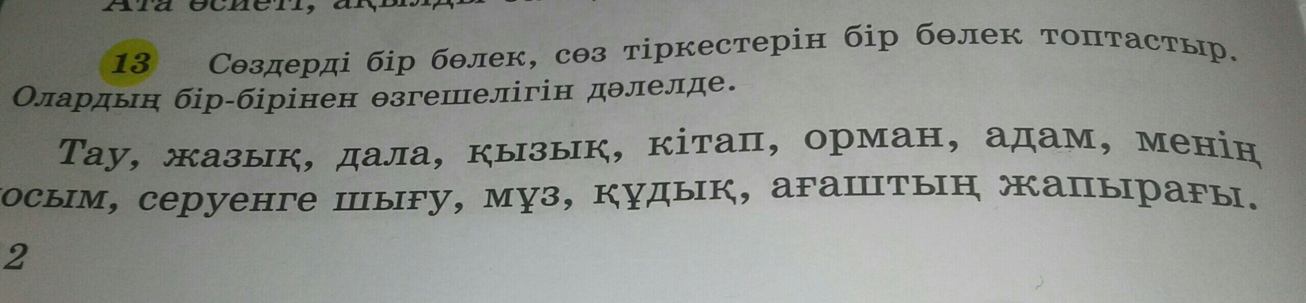 Тау,жазык,дала, қызық,кітап,орман,адам,мұз,құдық,сөздерге жатады.Қалған сөздерсөз тіркесіне жатады