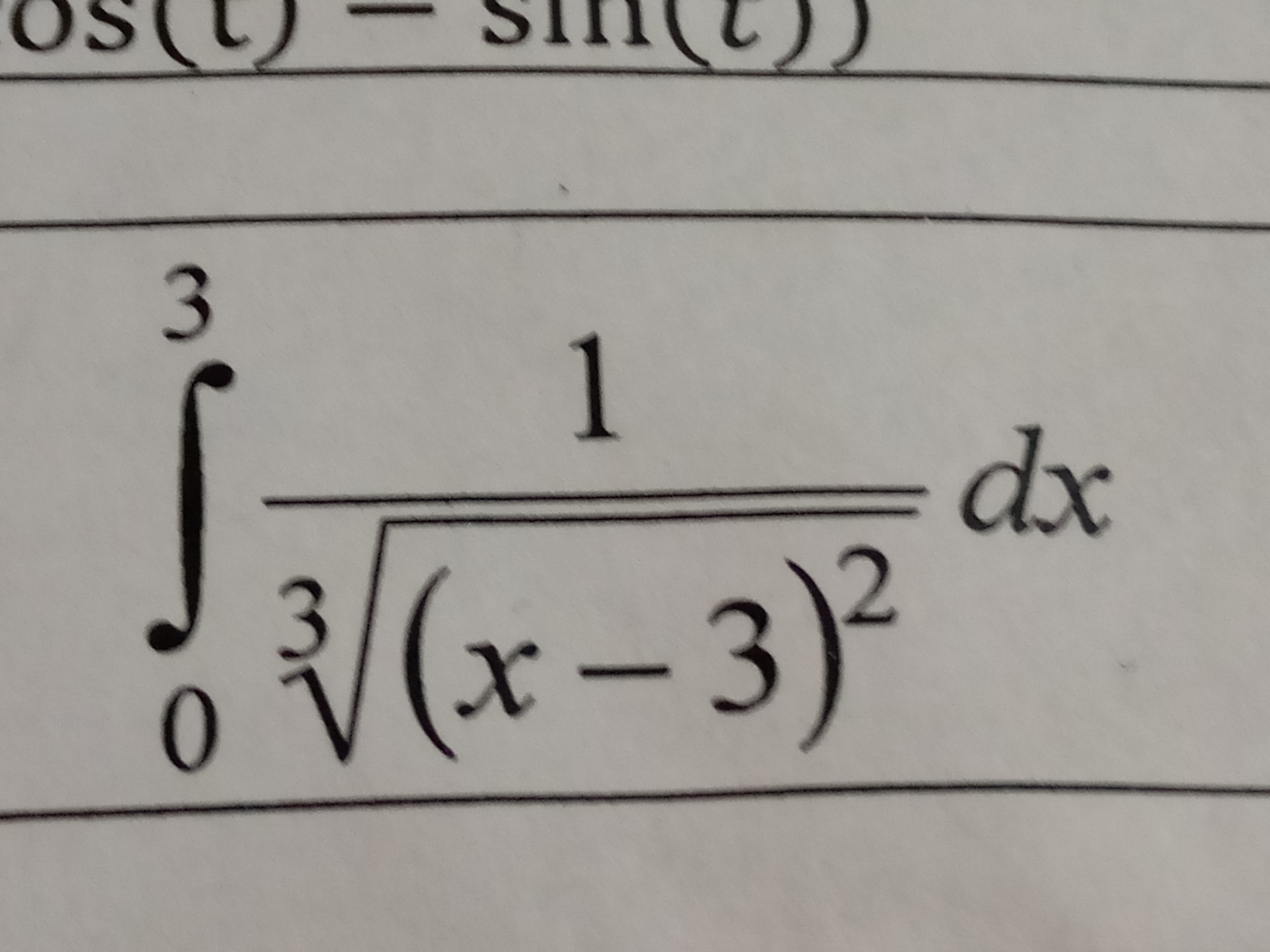displaystyleintlimits^3_0frac{dx}{sqrt[3]{(x-3)^2}}= lim_{b to 3-0}intlimits^b_0frac{d(x-3)}{sqrt[3]{(x-3)^2}}= lim_{b to 3-0}3sqrt[3]{x-3}|^b_0=\= lim_{b to 3-0}3sqrt[3]{b-3}-3sqrt[3]{-3}=3sqrt[3]{3}=4,327
