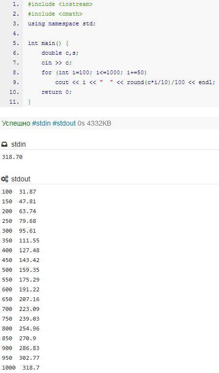 a)напечатать таблицу стоимости 50, 100, 150, ..... 1000 г сыра ( стоимость 1кг сыра вводится с клавиатуры) .