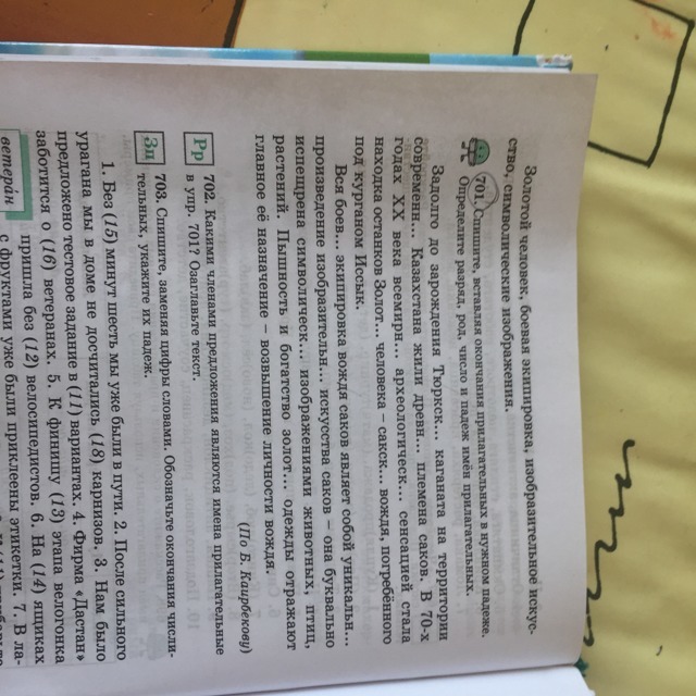 Задолго до зарождения Тюркского(относит.) каганата на территории современного(качеств.) Казахстана жили древние(качеств.) племена саков.В 70-х годах ХХ века всемирной(относит.) археологической(относит.) сенсацией стала находка останков Золотого(относит.) человека-сакского(притяжат.) вождя,погребённого под курганом Иссык.Вся боевая(относит.) экипировка вождя саков являет собой уникальное(качеств.) произведение изобразительного(относит.) искусства саков-она буквально испещрена символическими(относит.) изображениями животных,птиц,растений.Пышность и богатство золотой(относит.) одежды отражают главное её назначение-возвышение личности вождя.