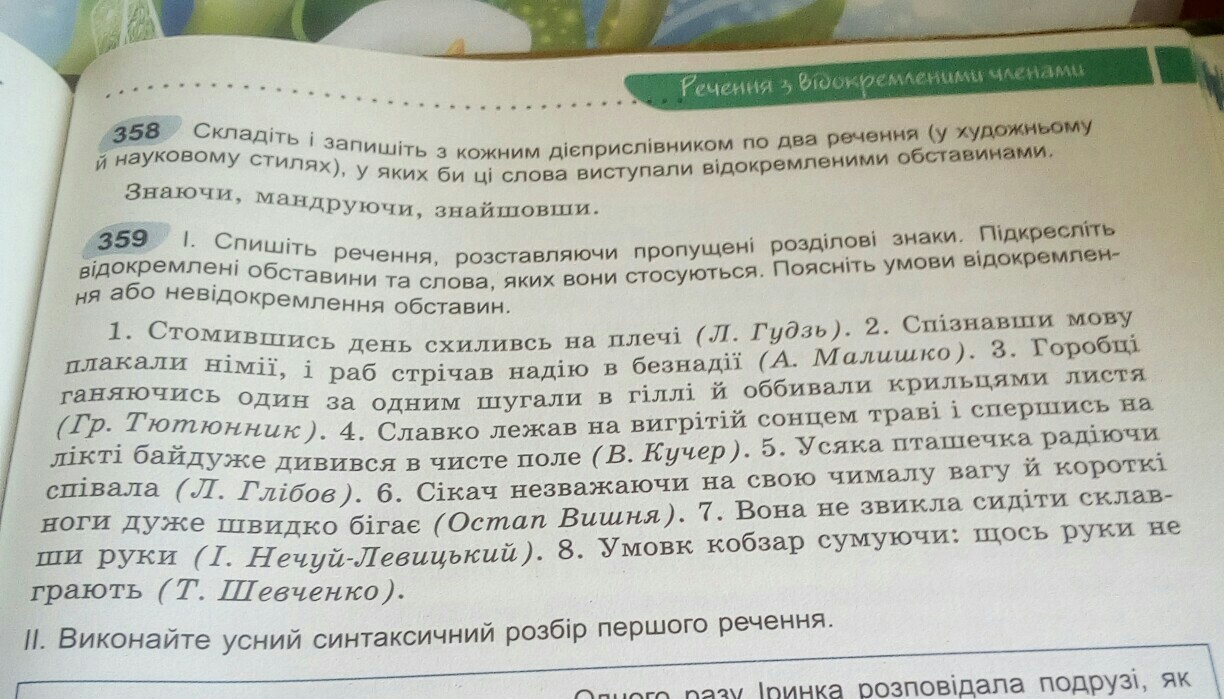 1) Стомившись, день схилилась на плечі. Спізнившись мову плакали німії, і раб, стрічав надію в безнадії. Горобці ганяючись один за одним шугали в гіллі, й оббивали крильцями листя. Славко лежав на вигрітій сонцем траві і, спершись на лікті, байдуже дивився в чисте поле. Усяка пташечка, радіючи співала. Сікач, незважаючи на свою чималу вагу й короткі ноги, дуже швидко бігає. Вона, не звикла сидіти, склавши руки. Умовк кобзар сумуючи: щось руки не грають.