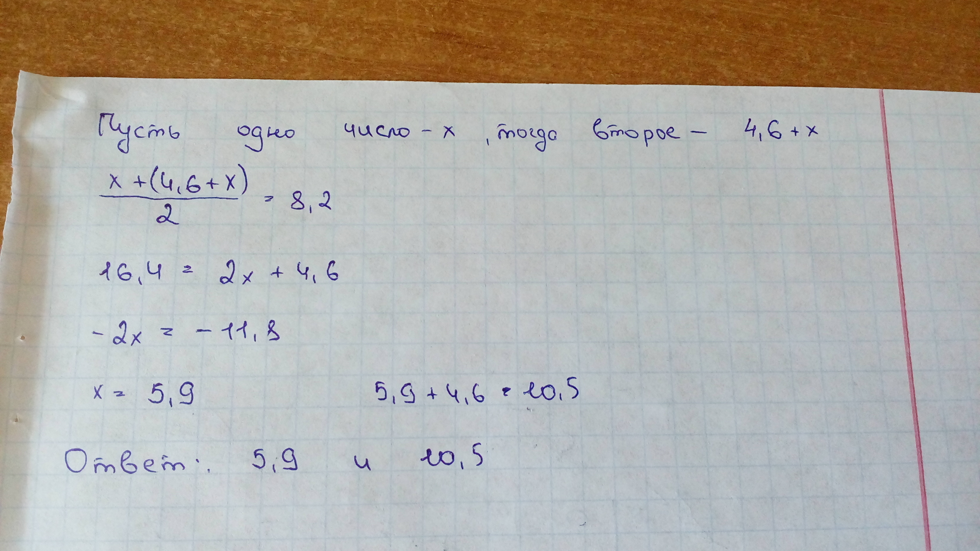 среднее арифметическое двух чисел, одно из которых на 4,6 больше второго, равно 8,2. Найдите эти числа.