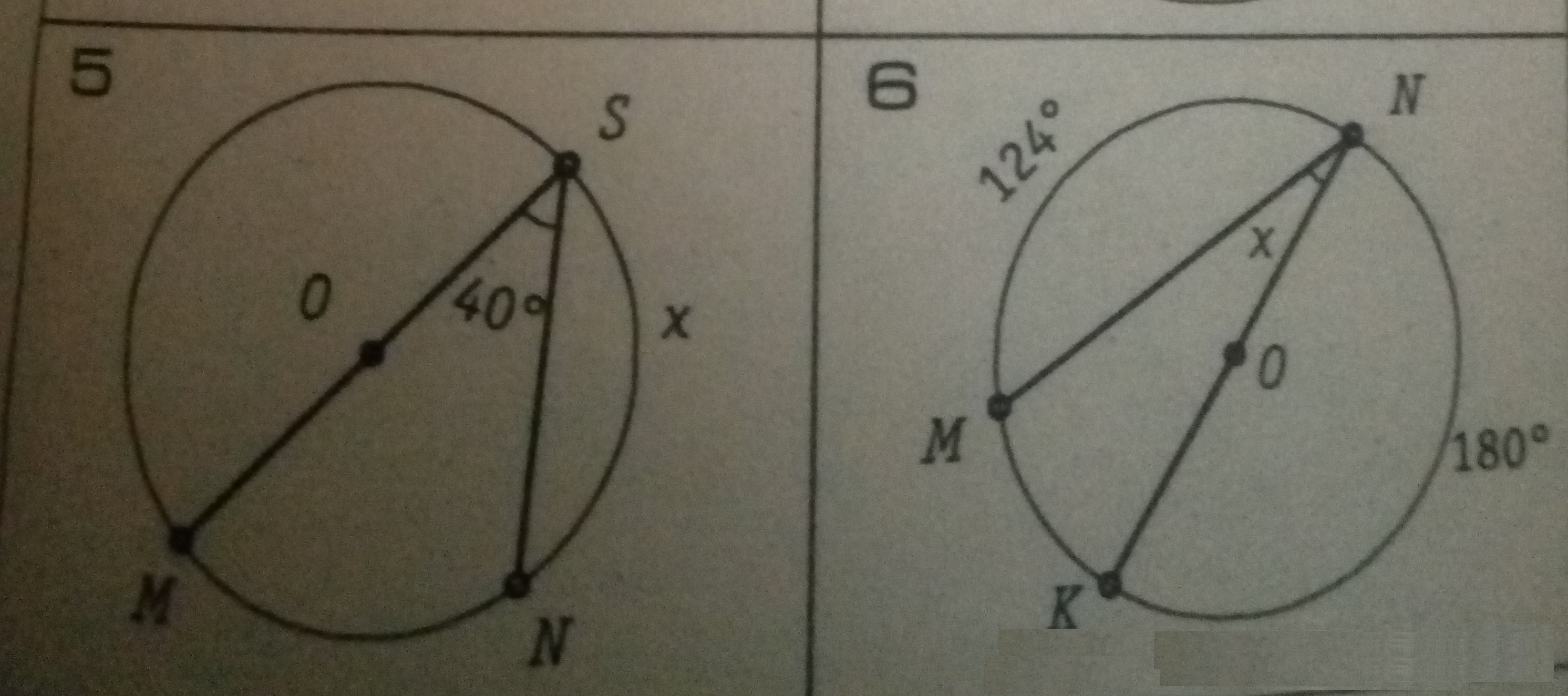 5. Так как SM - диаметр, то дуга SM=180°, угол MSN является вписанным, значит он равен половине дуги, на которую он опирается. Дуга MN=40°*2=80°.