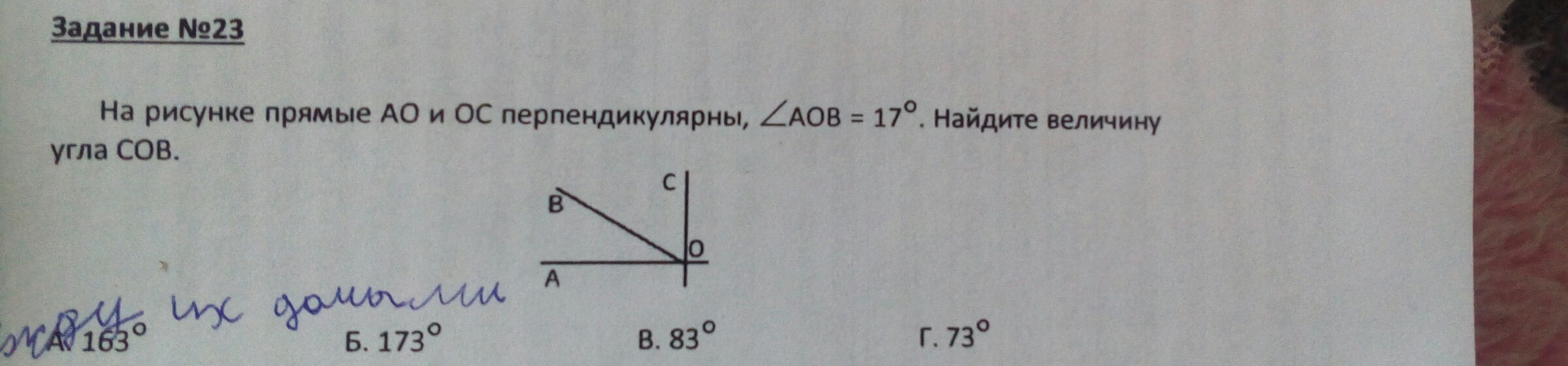 На рисунке прямые AO и OC перпендикулярны, угл AOB = 17°. Найдите величину угла COB.