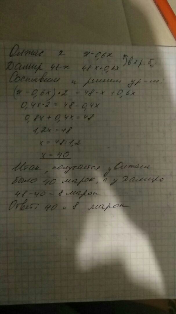 У о лжаса и дамира всего 48марок если олжас отдает дамиру 60% из своих марок то их у дамира окажется 2раза больше чем у о лжаса ск олько марок у каждого мальчика