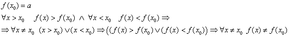 Вкратце - допускаем, что существует какой-то Х для которого f(x)=a. Из определения монотонности функции приходим к тому, что все значения для Х справа будут больше, а значения слева - меньше. Формальное доказательство - в приложении.