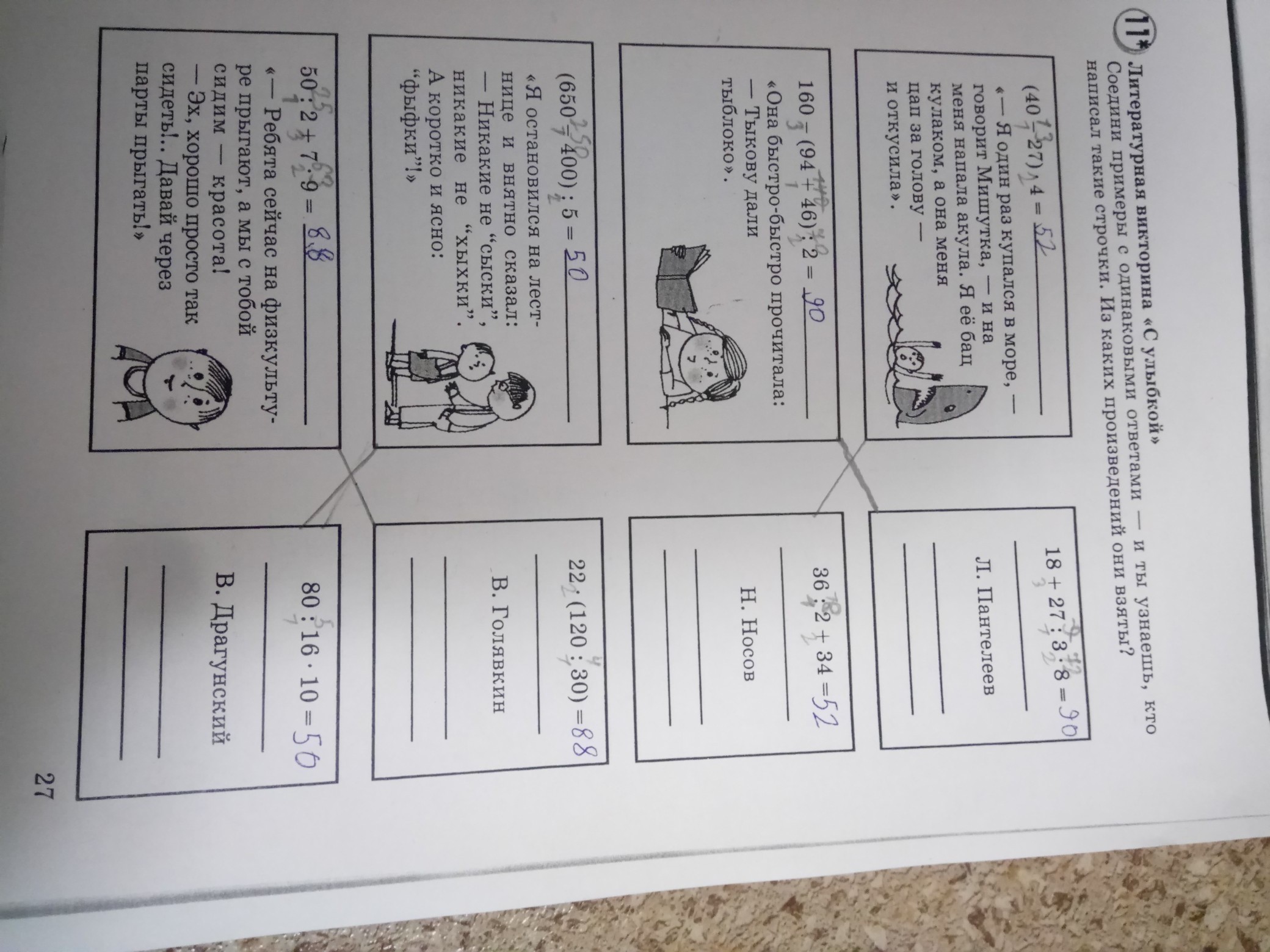 Соедини примеры с одинаковыми ответами и ты узнаешь кто написал такие строчки из каких произведений они взяты?