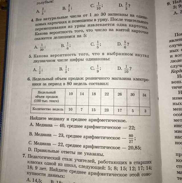 ответ С. медиана между 40 и 41 неделей...обе недели по 22...среднее перемножает и складываем каждый столбец.результат делим на 80. получится 22.85