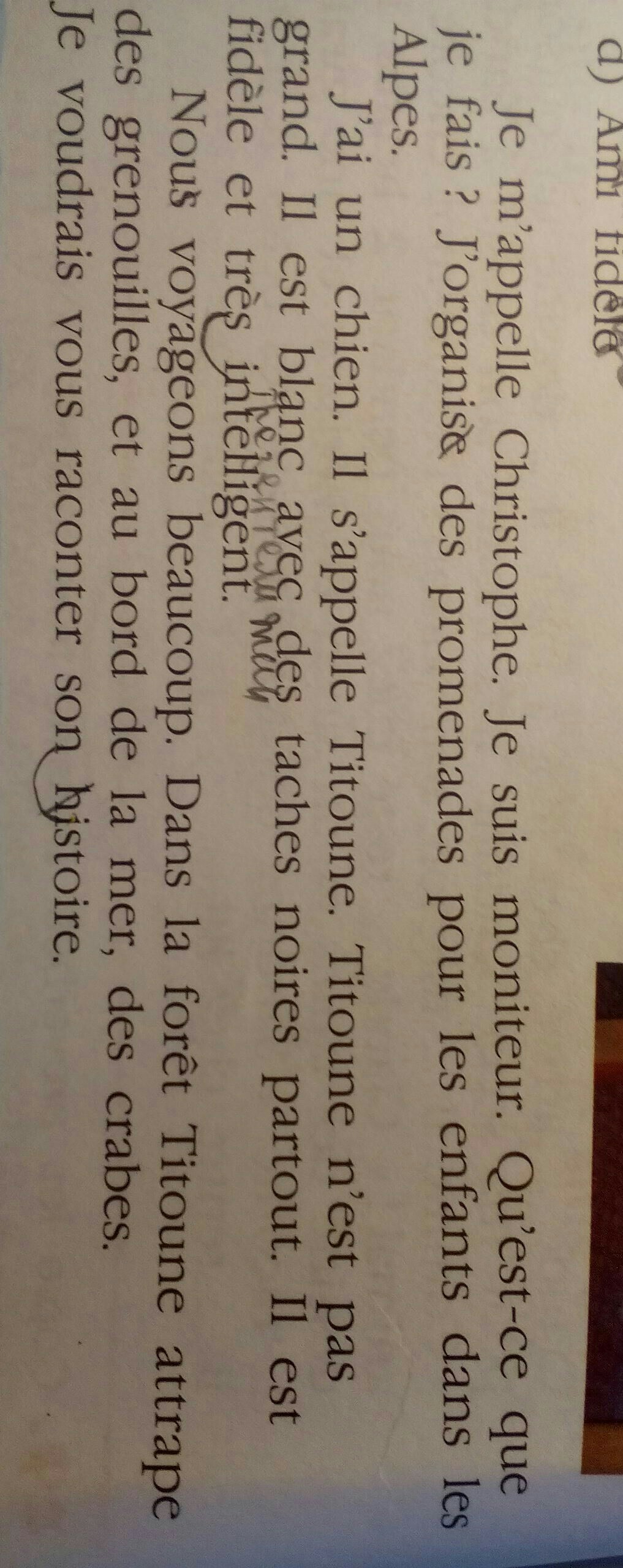 У меня есть собака. Его зовут Титун. Титун не высок. Он белый с чёрными пятнами повсюду. Он верен и очень умён.