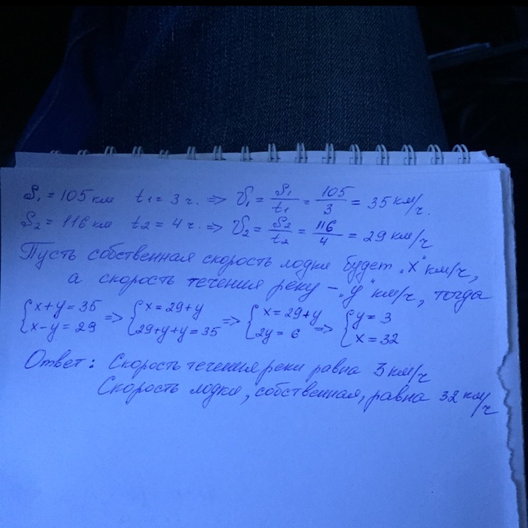 Моторная лодка проплыла по течению 105 км за 3ч, а против течения -116 км за 4 4. Найдите скорость течения и собственную скорость моторной лодки.