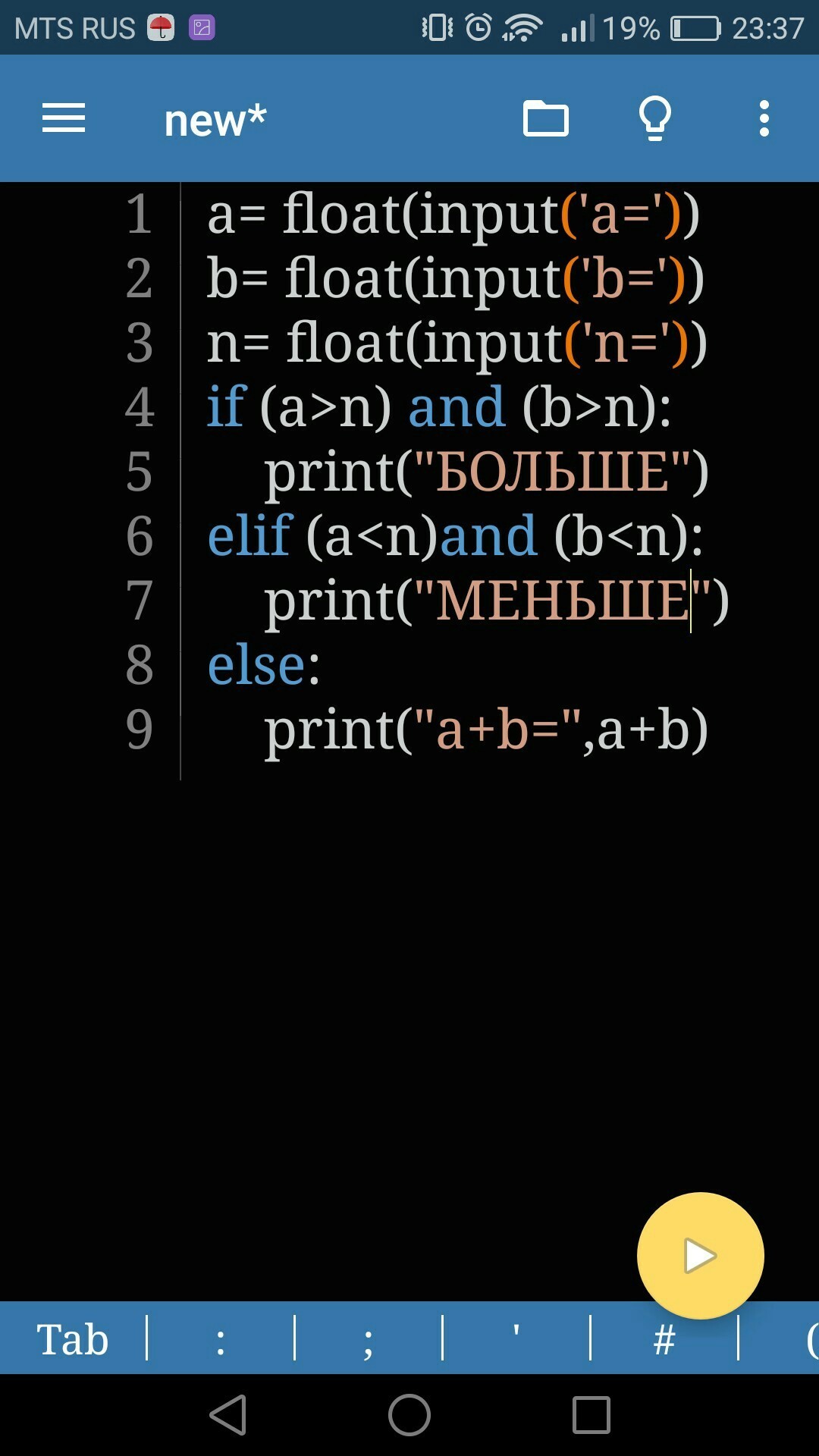 Введите с клавиатуры числа a, b и n . Если a и b больше n, то напечатайте слово «БОЛЬШЕ», если меньше n, то напечатайте «МЕНЬШЕ», иначе найдите и выведите сумму чисел a и b.