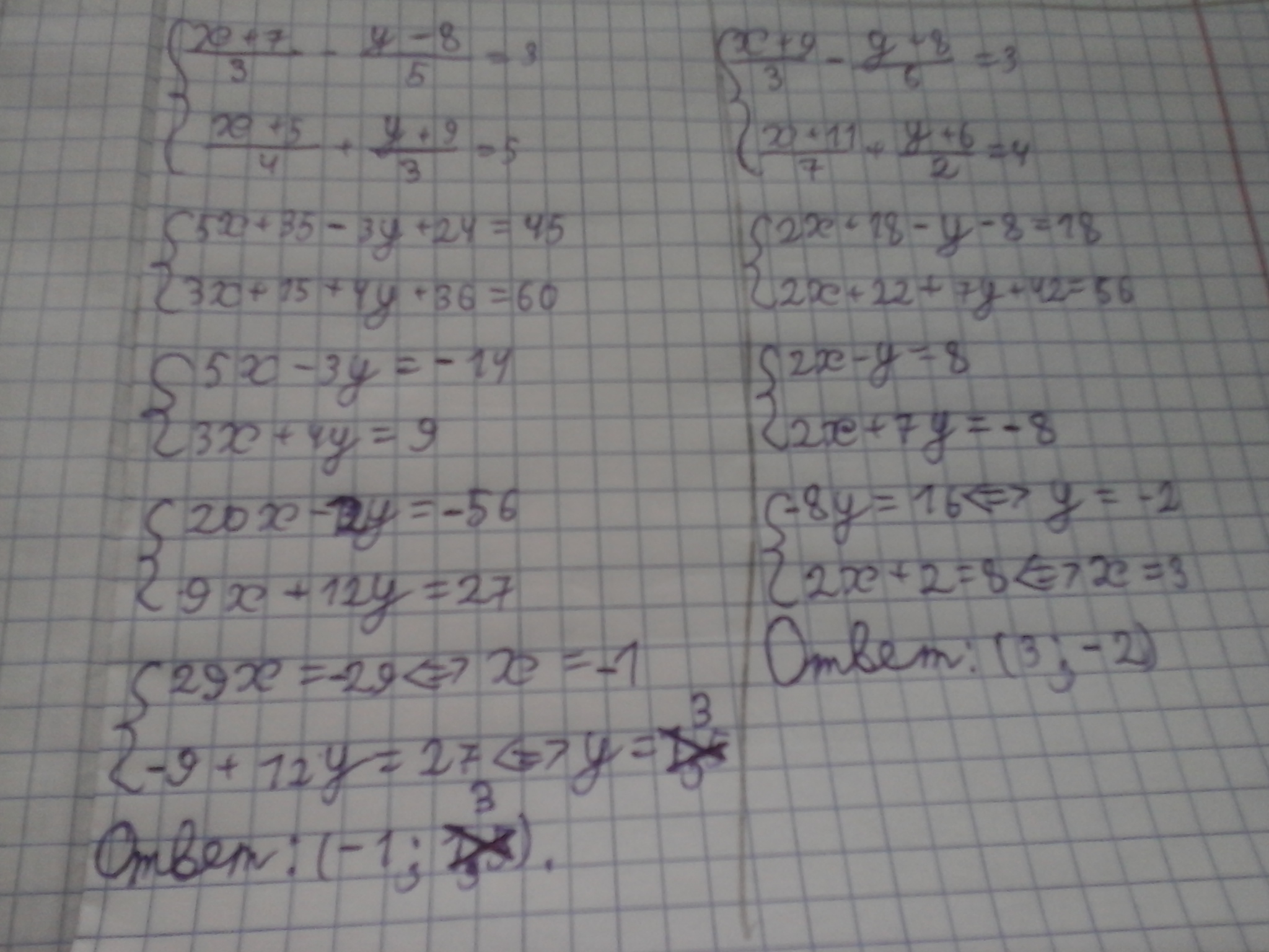 5(х+7)-3(у-8)=3*15⇒5х+35-3у+24=45⇒5х-3у=-14/*4⇒20х-12у=-56