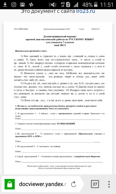Ответы-2-зарастающей( корень -раст-). 3.начинающий-начинать=с помощью суффикса-ющ. 4 приходит. 5.-и, а.6.-7 предложение.. 1.Начинающий натуралист шёл вдоль зарастающей молодым лесом лощины. 2 Здесь было ещё по-утреннему свежо и пахло листвой и крапивой. 3.Лог завернул влево, а впереди открылась освещённая солнцем поляна.4.Большой лесной голубь витюлень тяжело поднялся и , сверкнув белыми сгибами крыла, скрылся за кустами. 5.Немногие умеют ходить по лесу. 6.Обычно же двигаются так шумно, что мало-мальски осторожные звери и птицы успевают либо затаиться, либо убежать. 7.Уходя в лес, убегают вглубь дорожки и тропы.8. Нигде не увидишь столько интересных отпечатков, сколько на дорогах. 9.Двигаться по дороге и легче, и быстрее, а главное, бесшумнее. 10 Недаром чаще всего встречи с осторожными животными происходят на дорогах, а не в лесной глухомани. 11.Всем, кто приходит в лес за его дарами, надо правильно вести себя.