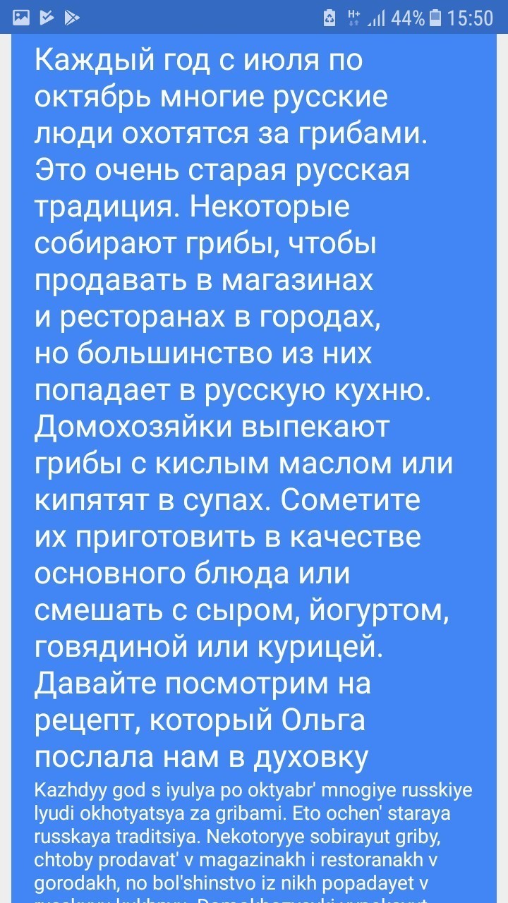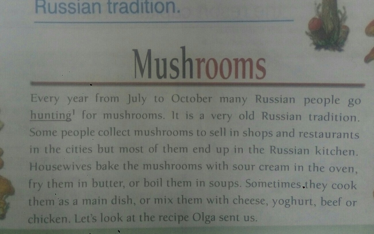 Каждый год с июля по октябрь русские люди охотятся за грибами. Это очень старая русская традиция. Некоторые люди собирают грибы, чтобы продавать в магазинах и ресторанах города, но большинство из них попадает на российскую кухню. Домохозяйки выпекают грибы со сметаной в духовке, обжарьте их на масле или смешайте в супах. Иногда они готовят их в качестве основного блюда или смешивают с сыром, йогуртом, говядиной или курицей. Давайте посмотрим на рецепт, который Ольга послала нам.