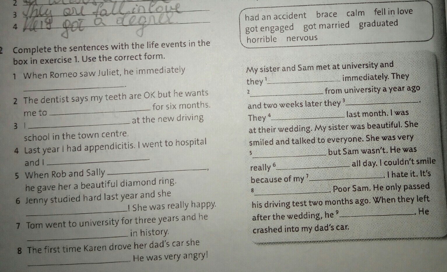 1 fall in love. 2 ???? 3 learn to drive. 4 have an operation. 5 get engaged. 6 get degree. 7 pass his exam/test. 8 have in accident.
