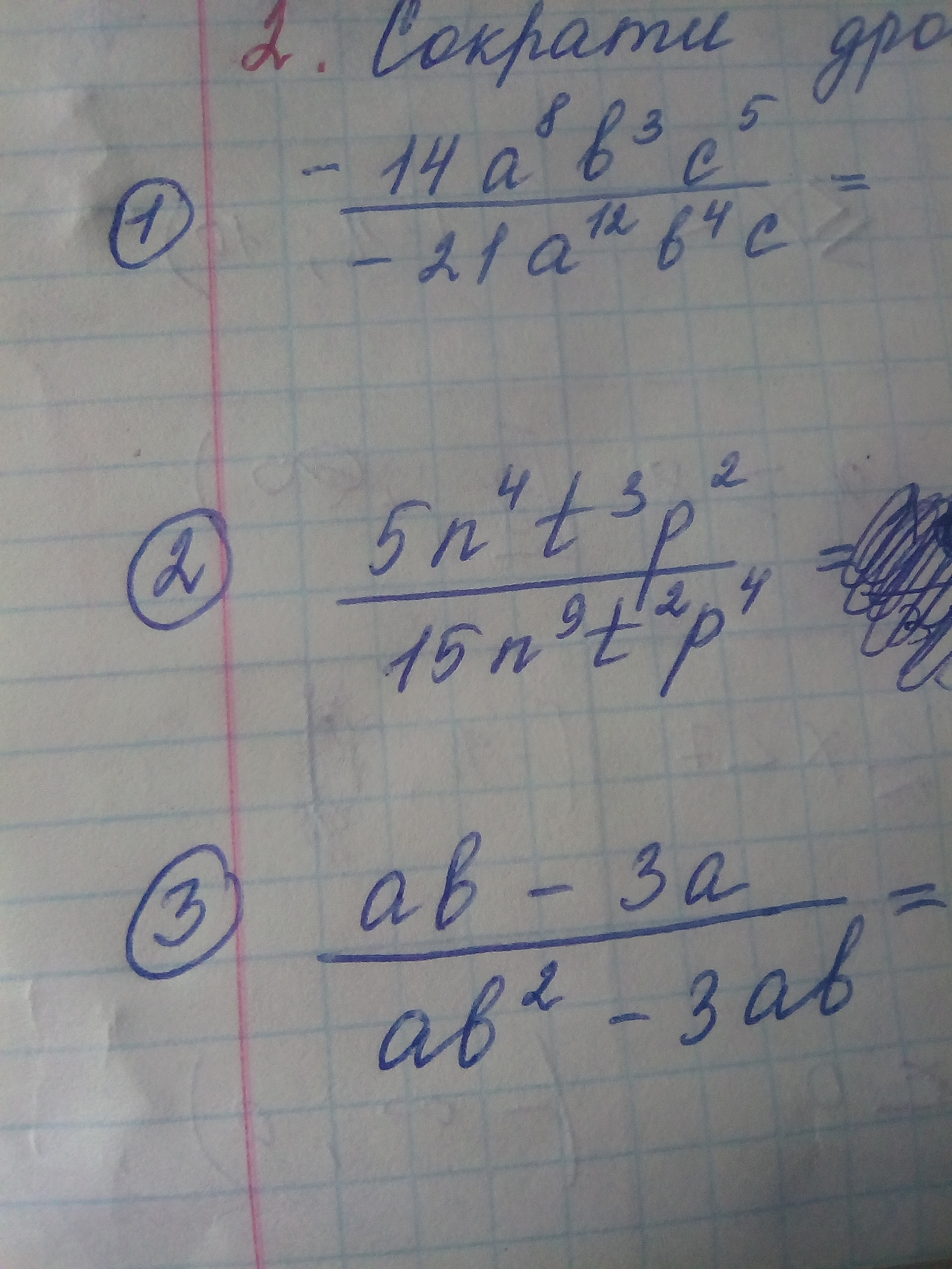 displaystyle 1).. frac{-14a^{8}b^{3}c^{5}}{-21a^{12}b^{4}c}= frac{2}{3}*a^{8-12}b^{3-4}c^{5-1}= frac{2}{3}*a^{-4}b^{-1}c^{4}= frac{2c^{4}}{3a^{4}b}; \  \  \ 2).. frac{5n^{4}t^{3}p^{2}}{15n^{9}t^{2}p^{4}}= frac{1}{3}*n^{4-9}t^{3-2}p^{2-4}= frac{1}{3}*n^{-5}tp^{-2}= frac{t}{3n^{5}p^{2}}; \  \  \ 3).. frac{ab-3a}{ab^{2}-3ab}= frac{a(b-3)}{ab(b-3)}= frac{1}{b};