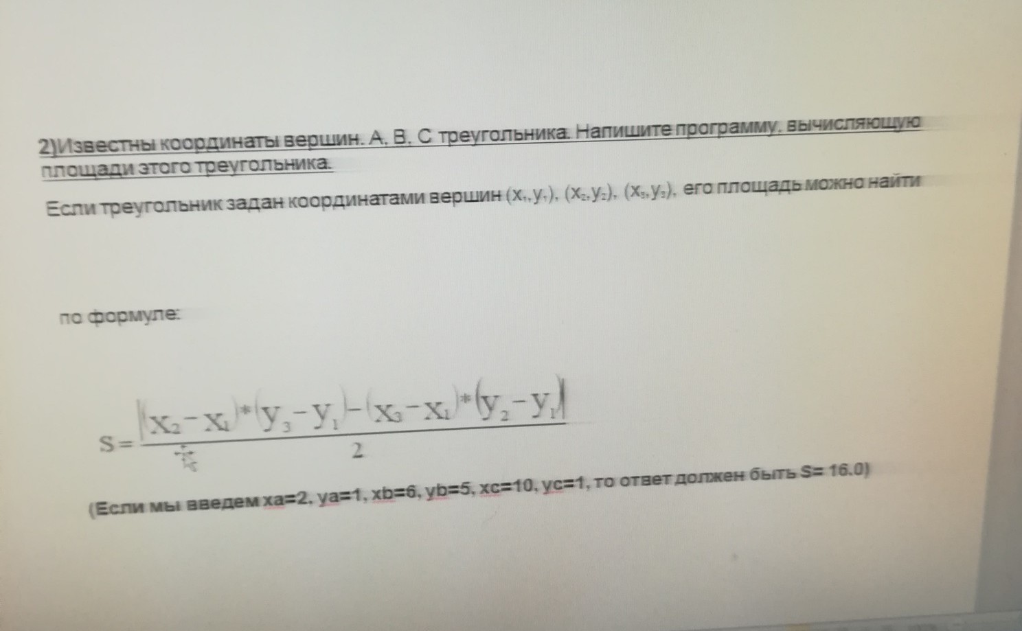 S:=(abs((xb-xa)*(yc-ya)-(xc-xa)*(yb-ya))/2);