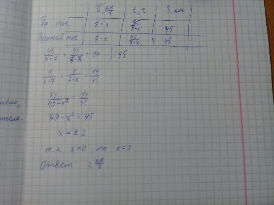 Моторная лодка, собственная скорость которой 7 км/ч, прошла расстояние, равное 45 км, против течения и такое же расстояние по течению реки. Найдите скорость течения реки, если время, затраченное на весь путь, равно 14 ч