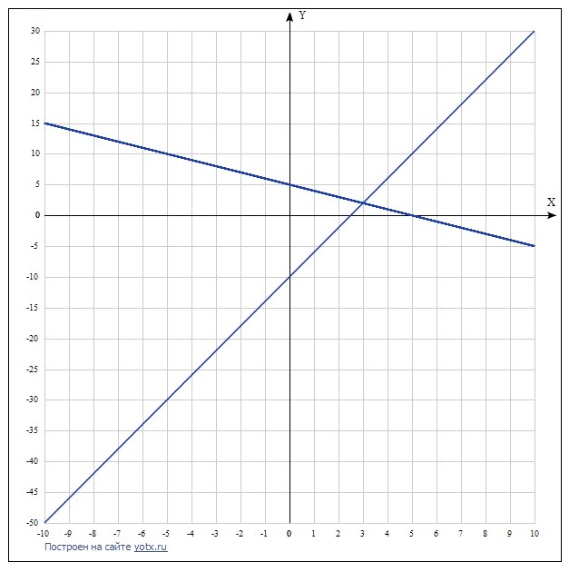 Строим графики прямых в одной системе координат: легче всего сделать это по точкам (берете x = 1; 2; 3; 4; -1; 2; -3; -4; 0 и т.д., пока не будет достаточно, чтобы построить график точно, но в случае с прямыми достаточно двух точек :)) (график приложила) и смотрите точку пересечения. Это (3; 2) – ваш ответ.