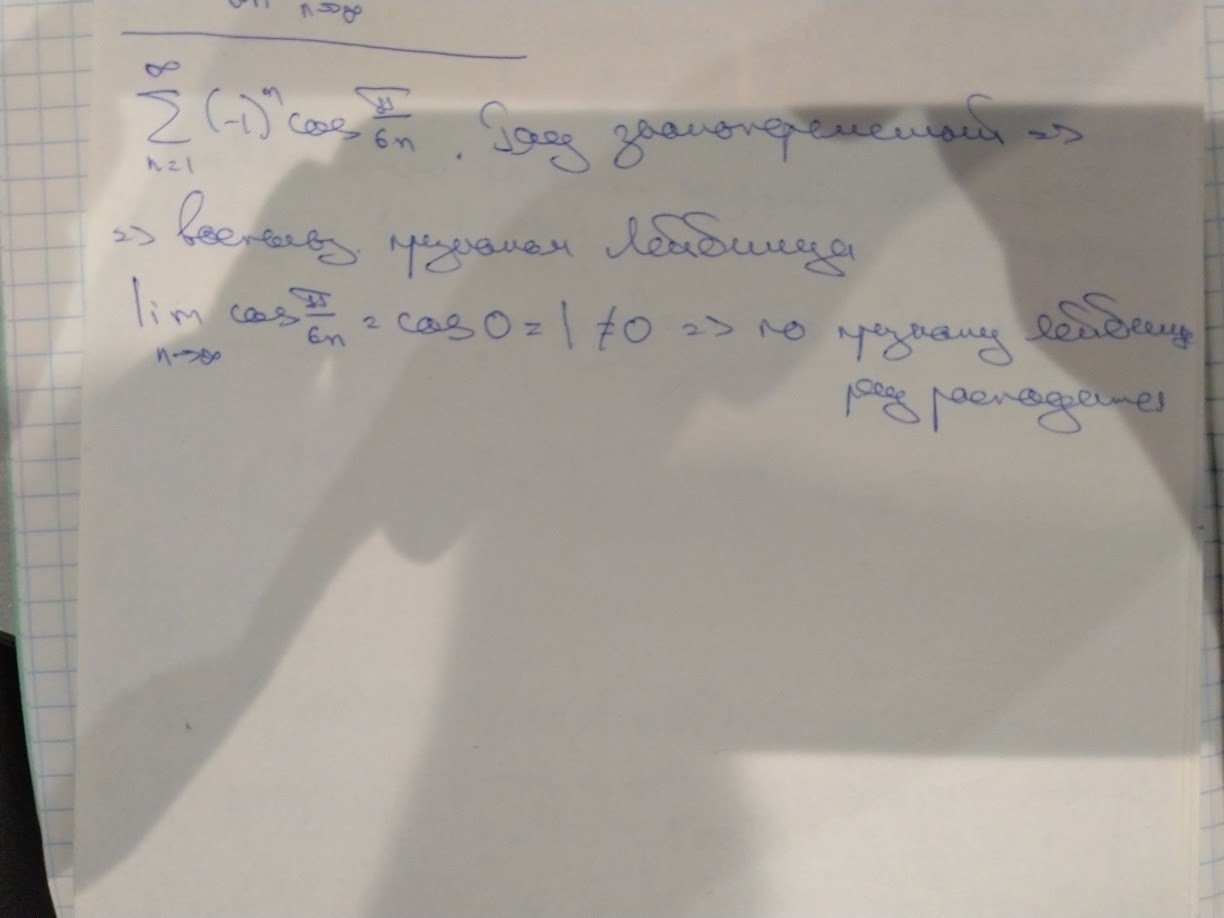 Решите плизз) ❤️даю 100 баллов. Исследовать сходимость, абсолютную сходимость или расходимость рядов. Σ(сверху ∞, снизу n=1) ((-1)^n(cos(пи/6*n)));