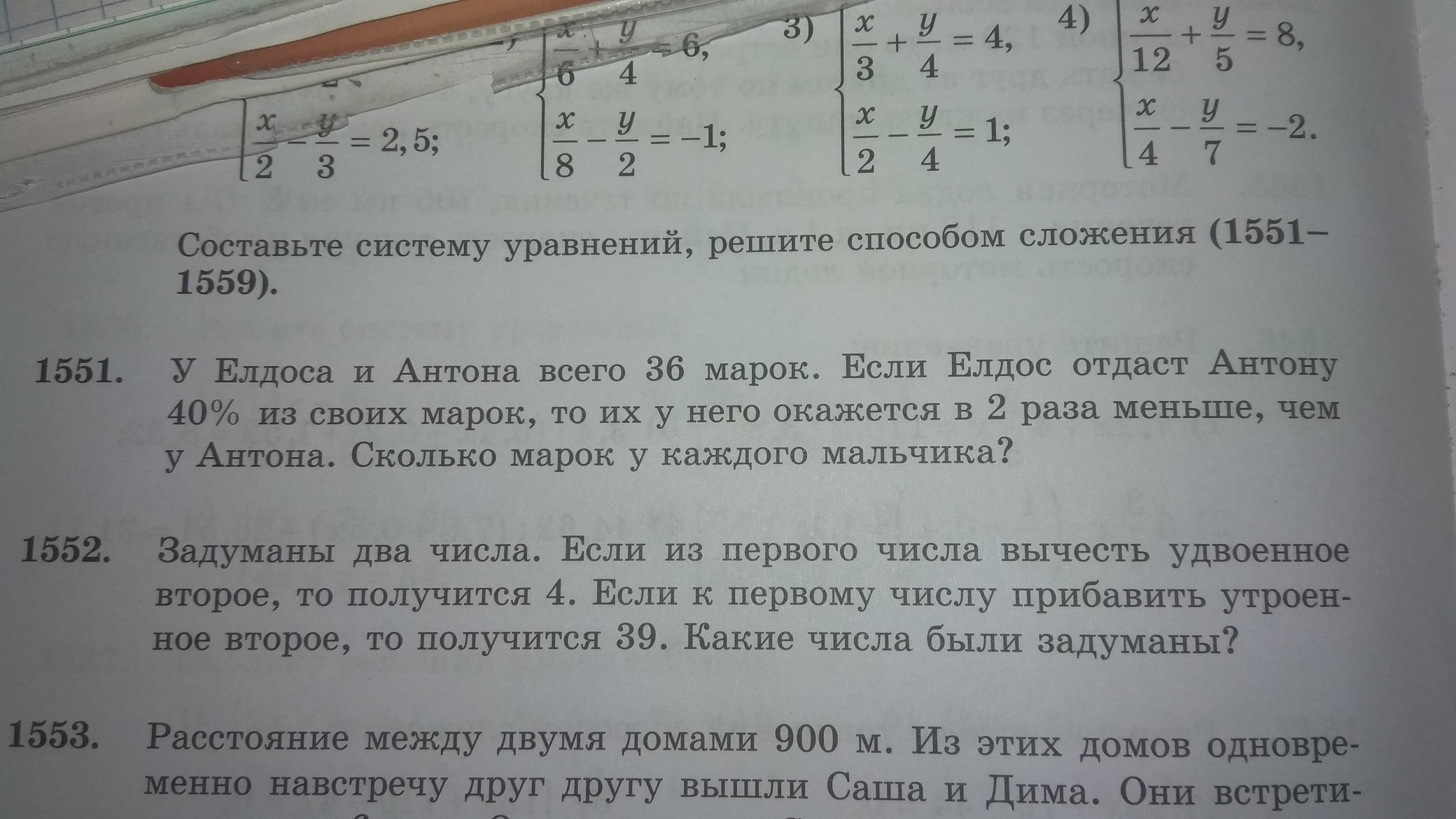Пусть у Елдоса было х марок, а у Антона было у марок. Составим и решим уравнения: х+у=36, у=36-х; 2*(х-0,4*х)=0,4*х+у; Подставим выражение из первого уравнения во второе: 2*(х-0,4*х)=0,4*х+36-х; 2*х-0,8*х=0,4*х+36-х; 3*х-1,2*х=36; 1,8*х=36; х=20; у=36-20=16; Ответ: у Елдоса было 20 марок, а у Антона было 16 марок.