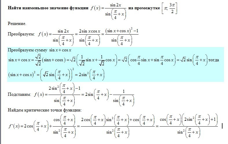 Найдите наименьшее значение функции f(x)=sin2x/sin(П/4+х) на промежутке [П;3П/2]
