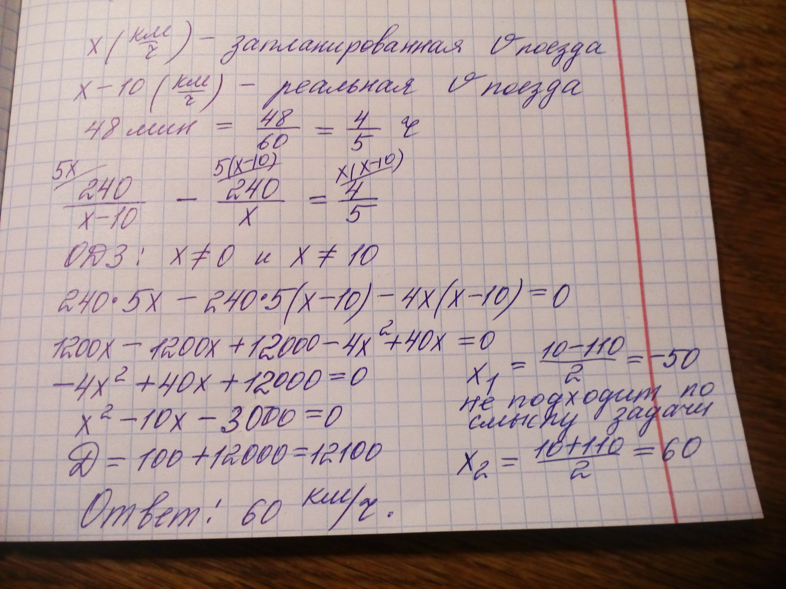 На перегоне, длина которого равна 240 км, поезд шел со скоростью 10 км/ч меньшей, чем должна быть по расписанию, и опоздал на 48 мин. С какой скоростью должен был идти поезд по расписанию?