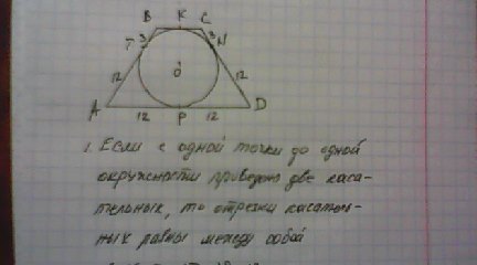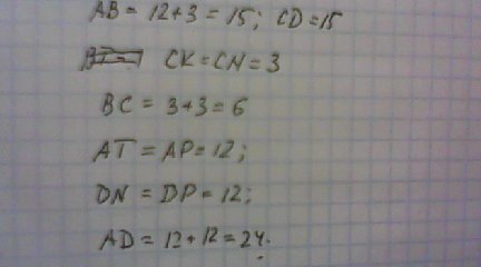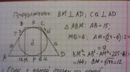 Точка дотика вписано в рівнобічну трапецію, ділить бічну сторону на відрізки 12 см і 3 см. Знайдіть площу трапеції