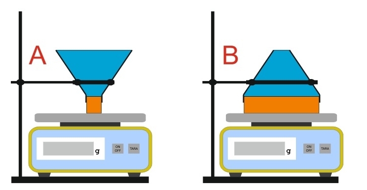 Воронки закреплены в штативах, так что воронки не касаются весов, а поршень упирается в чашу весов. Если весы убрать, поршни выпадут, и вода выльется.