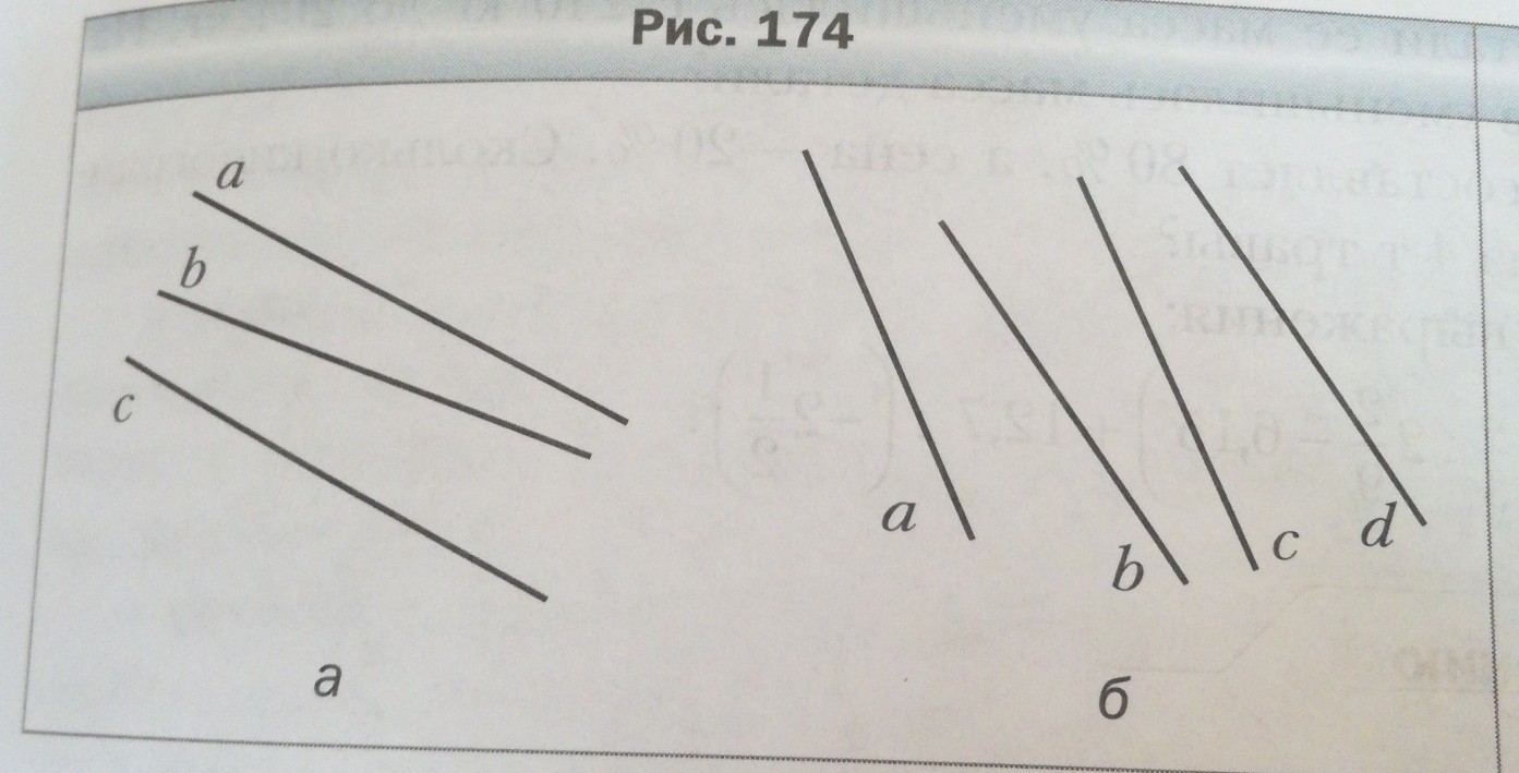 определите на глаз, а потом проверьте с помощью угольника и линейки,какие из прямых, изображенных на рисунке 174,параллельны.