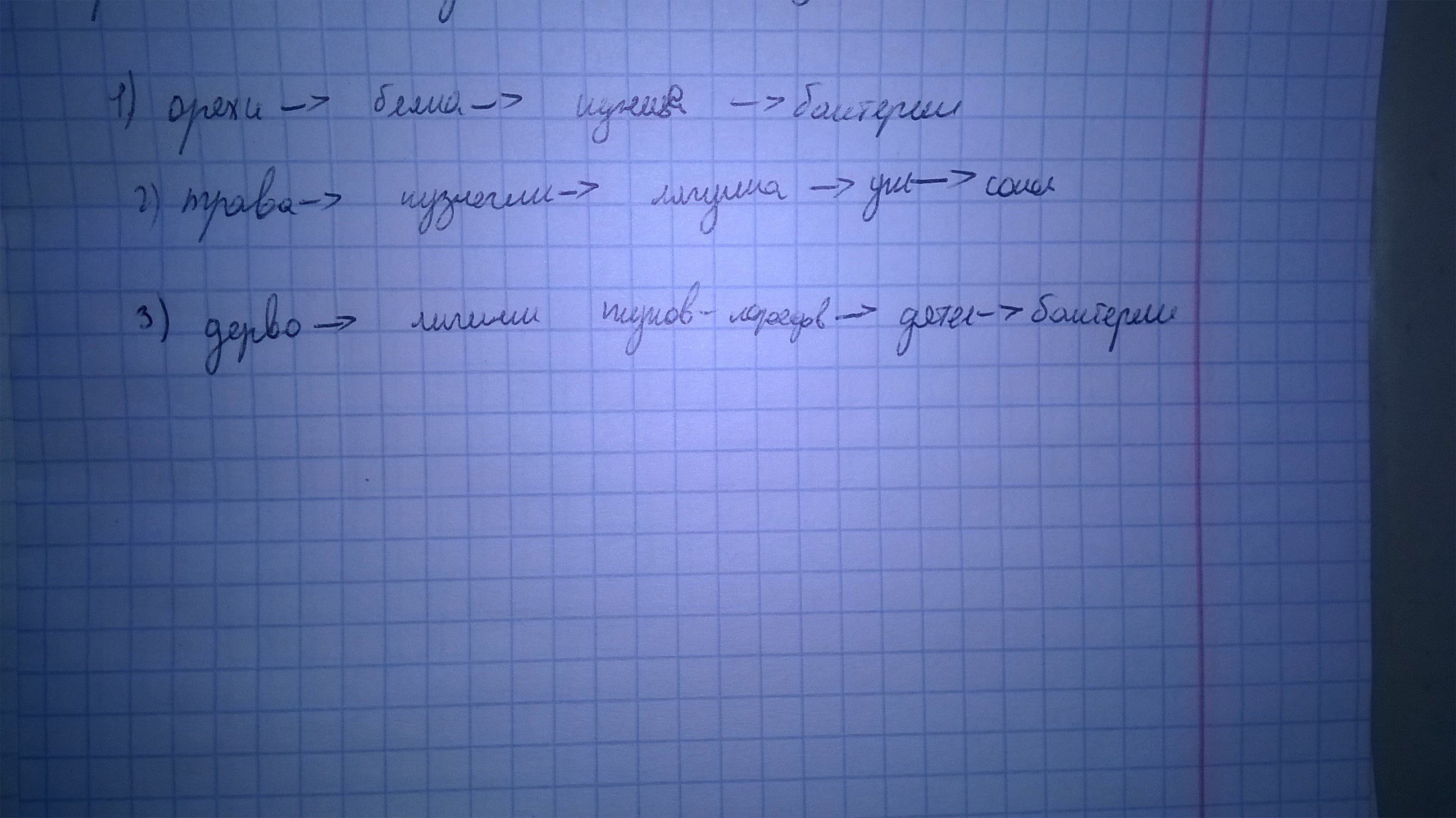 Исправьте цепи питания : бактерии - орехи - белка - куница трава - лягушка - кузнечик - уж - сокол дерево - дятел - личинки жуков-короедов - бактерии