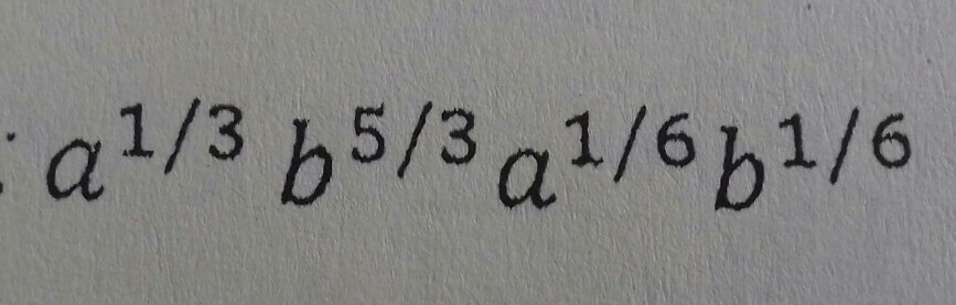 displaystyle a^{1/3}b^{5/3}a^{1/6}b^{1/6}=a^{2/6}*a^{1/6}*b^{10/6}*b^{1/6}= \  \ =a^{2/6+1/6}*b^{10/6+1/6}=a^{1/2}*b^{11/6}= sqrt[6]{a^{3}b^{11}};