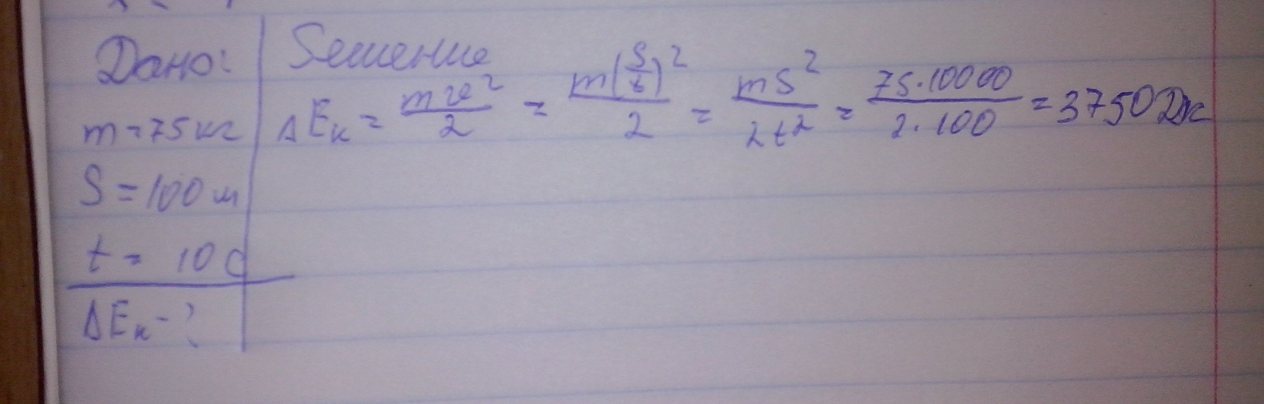 Визначити кінетичну єнергію спортсмена масою 75кг, що пробігає стометрівку за 10с. Швидкість спортсмена вважати сталою.