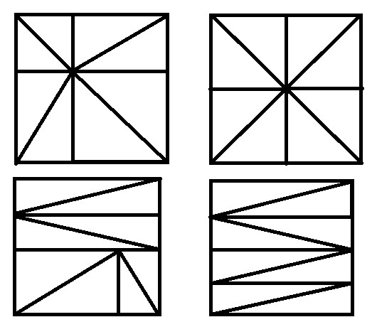 Вообще, вариантов можно придумать кучу, вот для примера ещё 4 способа разделить квадрат на 8 прямоугольных треугольников.
