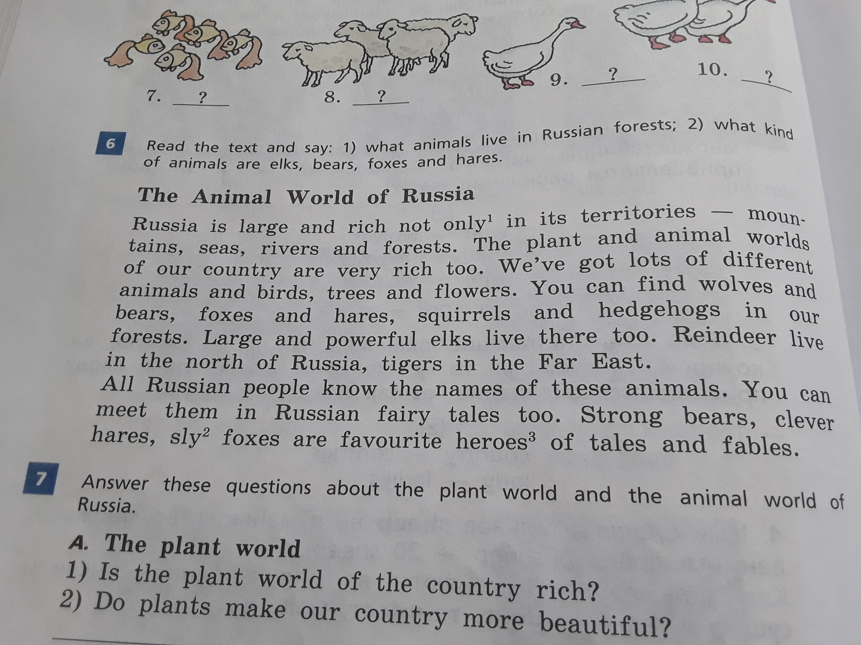 Read the text and say: 1) What animals live in Russia forists; 2) what kind of animals are elks, bears, foxes and hares.