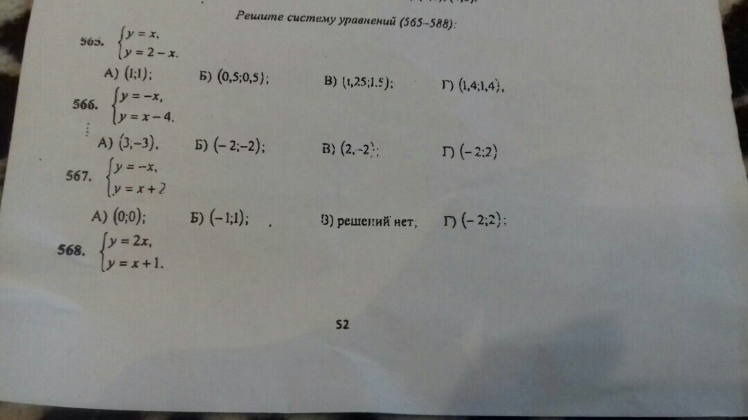 565. Подставляем (1) в (2): y = 2 - y, y = 1. Обратно в (1): x = 1.