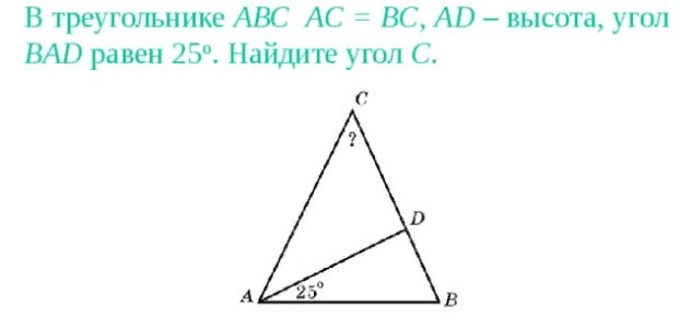В треугольнике АВС AC = BC , AD – высота , угол BAD равен 25 o . Найдите угол C . прошу помогите пожалуйста, напишите подробнее решение,дам 70 баллов