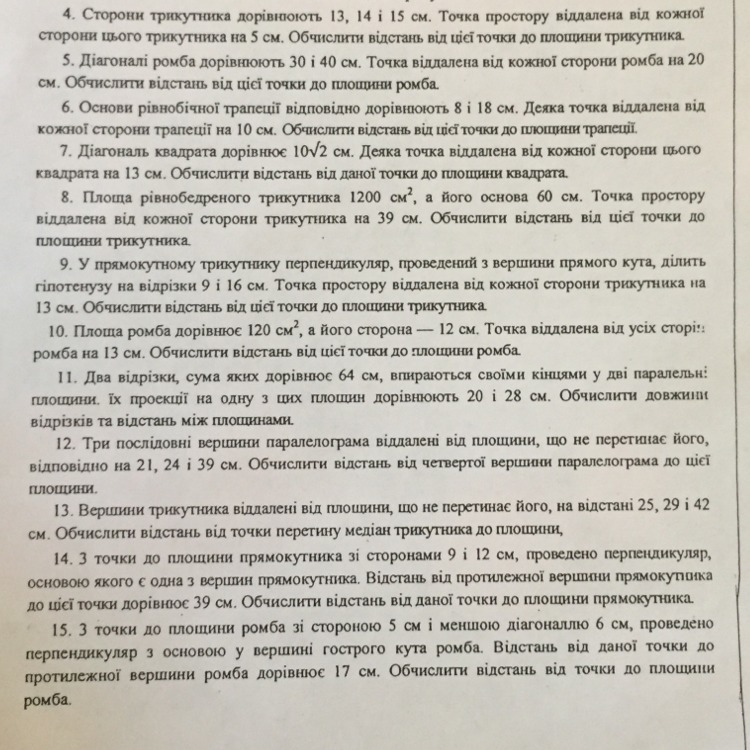 4. Діагоналі ромба дорівнюють 30 і 40 см. Точка віддалена від кожної сторони ромба на 20 см. Обчислити відстань від цієї точки до площини ромба.