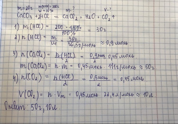 Найдите какая масса соли и какой объем газа образуется в результате реакции между CaCO3 c 20г и HCl 200г с w(HCl) 15%