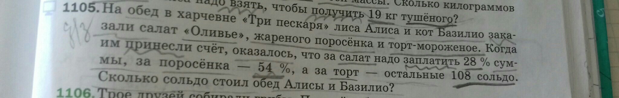 на обед в харчевне Три пескаря Лиса Алиса и кот Базилио заказали салат Оливье жареного поросёнка этот мороженое когда и принесли счет оказалось что за салат на платить 28% сумма за поросёнка 54% А за торт остальные 180 Сколько стоил обед Алиса и Базилио Выполни краткую запись и реши задачу