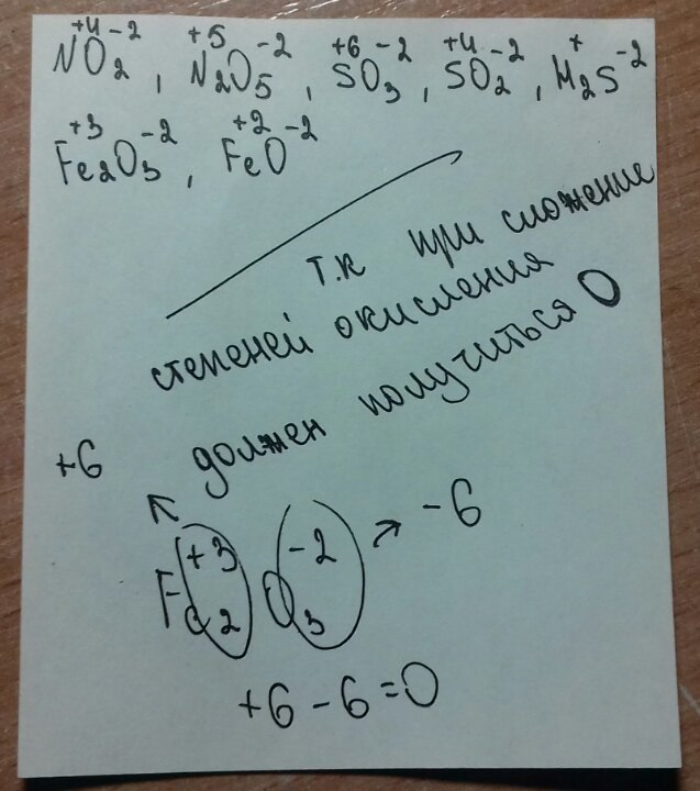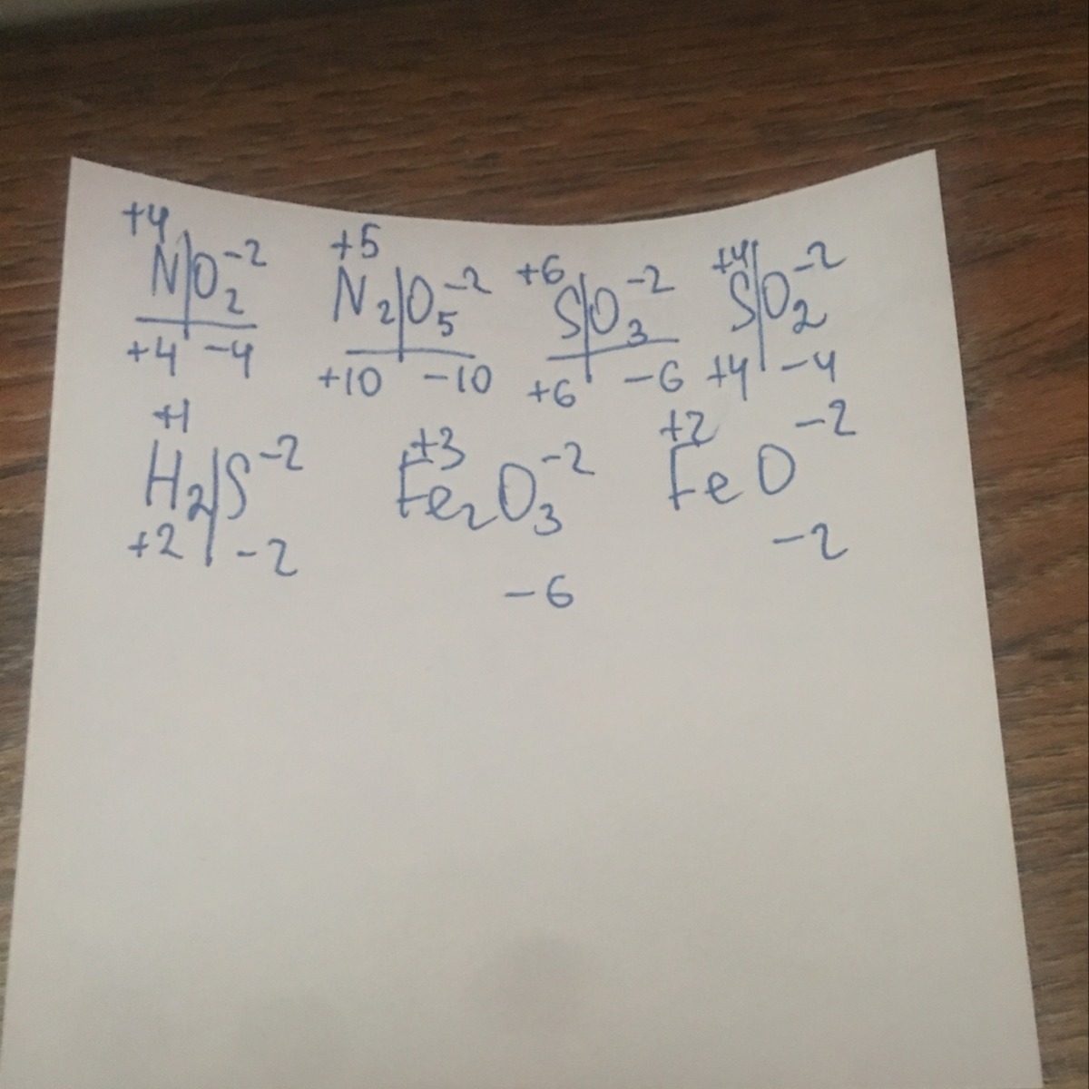 Здравствуйте. Помогите пожалуйста с домашним вычислите степень окисления следующих соединений: NO2; N205; SO3; SO2; H2S; Fe2O3; FeO. ( Только решением, пожалуйста)Заранее спасибо