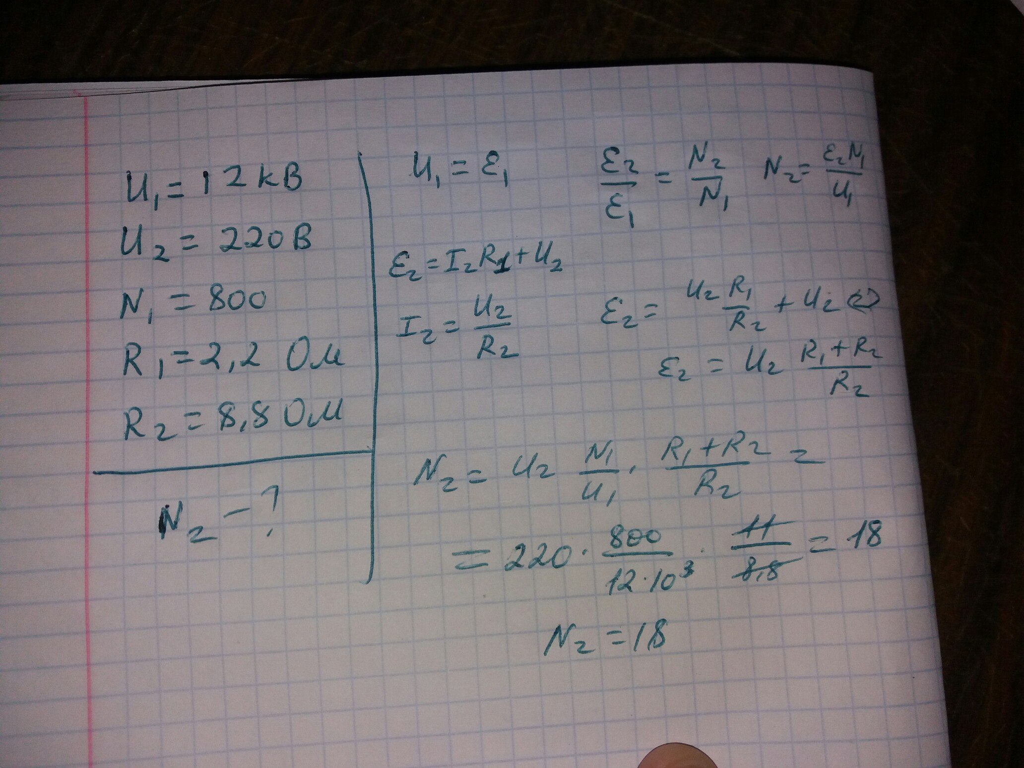 Автотрансформатор повышает напряжение с 12В до 220В. В первичной обмотке трансформатора содержится 800 витков. Сопротивление вторичной обмотки составляет 2,2Ом, сопротивление внешней цепи равно 8,8Ом. Пренебрегая сопротивлением первичной обмотки, определите число витков во вторичной обмотке.