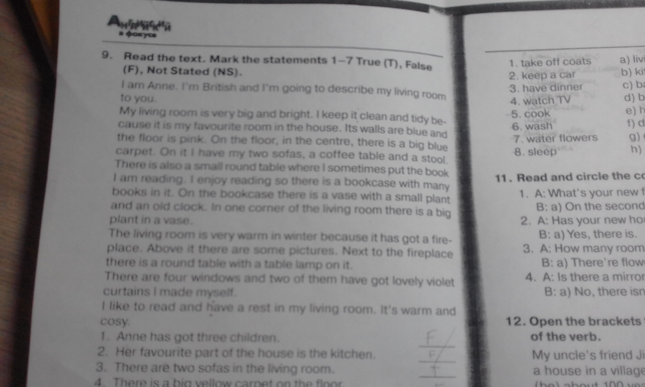 Я Аня. Я британка и хочу описать вам мою гостиную. Она очень большая и светлая. Я держу ее в чистоте и порядке, потому что это моя любимая комната во всем доме. У неё белые стены и розовый пол. На полу, посредине есть большой синий ковёр.На нём у меня стоят два дивана.кофейный столик и стул. Есть также маленький круглый стол,куда я ставлю книги,которые читаю. Мне нравиться читать,поэтому там есть книжный шкаф с множеством книг. На книжном шкафу стоит ваза с маленьким растением и старыми часами возле. В углу гостиной стоит большое растение в вазе. Гостиная очень тёплая зимой,потому что там есть камин. Над ним несколько фотографий. Рядом с камином стоит круглый стол с настольной лампой. В комнате четыре окна, два из них имеют прекрасные фиолетовые шторы,которые я сделала сама.Я люблю читать и отдыхать в моей гостиной. Она теплая и уютная.