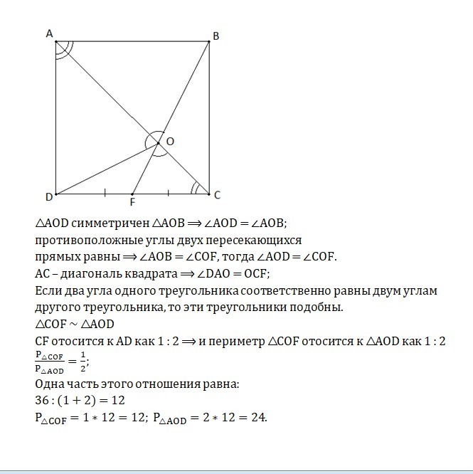 Точка F середина стороны CD квадрата ABCD, AC пересекается с BF в точке O. Сумма периметров треугольников AOD и COF равнa 36 см. Вычислите периметры треугольников AOD и COF