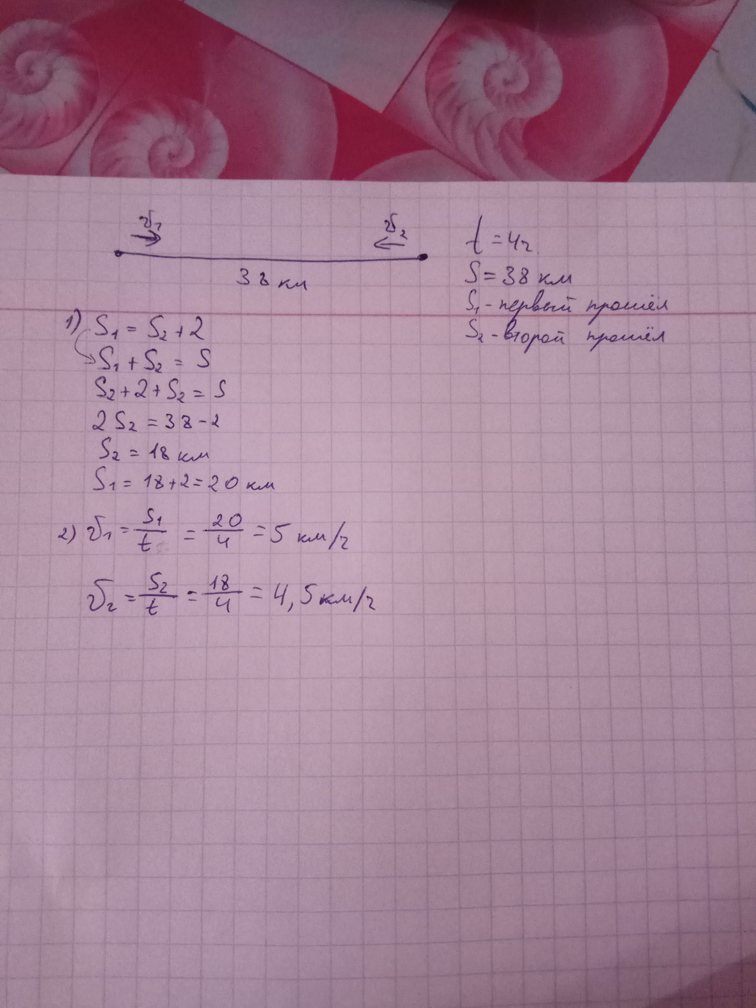 2 туриста вышли одновременно из 2 городов расстояния между которыми 38 км и встретелись через 4 часа. С какой скоростью шел каждый, если 1 до встречи прошел на 2 км больше чем второй. Пожалуйста, прошу, помогите. НУЖНО ОЧЕНЬ СРОЧНО!!!