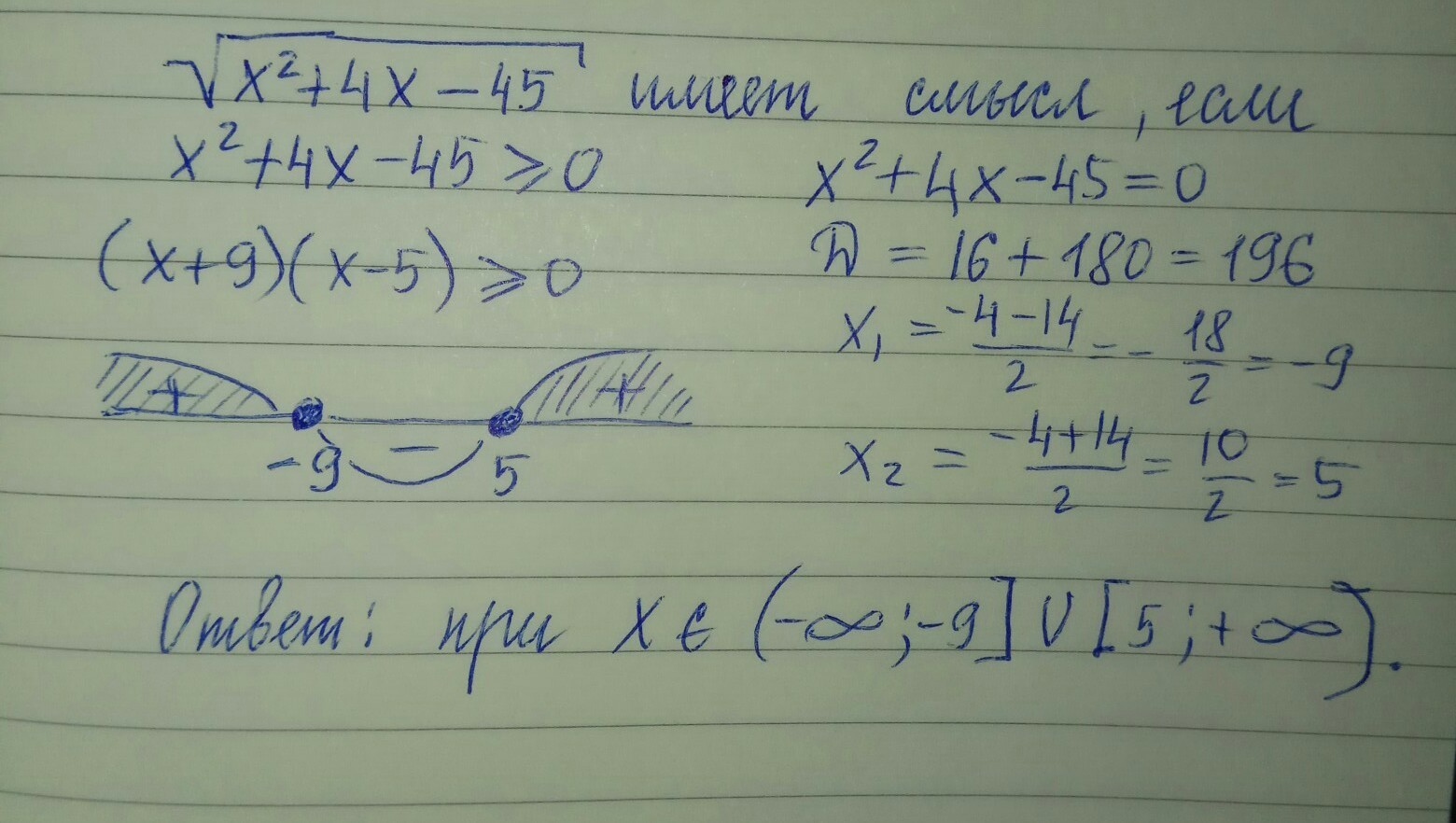 Ответ: D(f): x ∈ (-∞; -9]U[5; ∞).