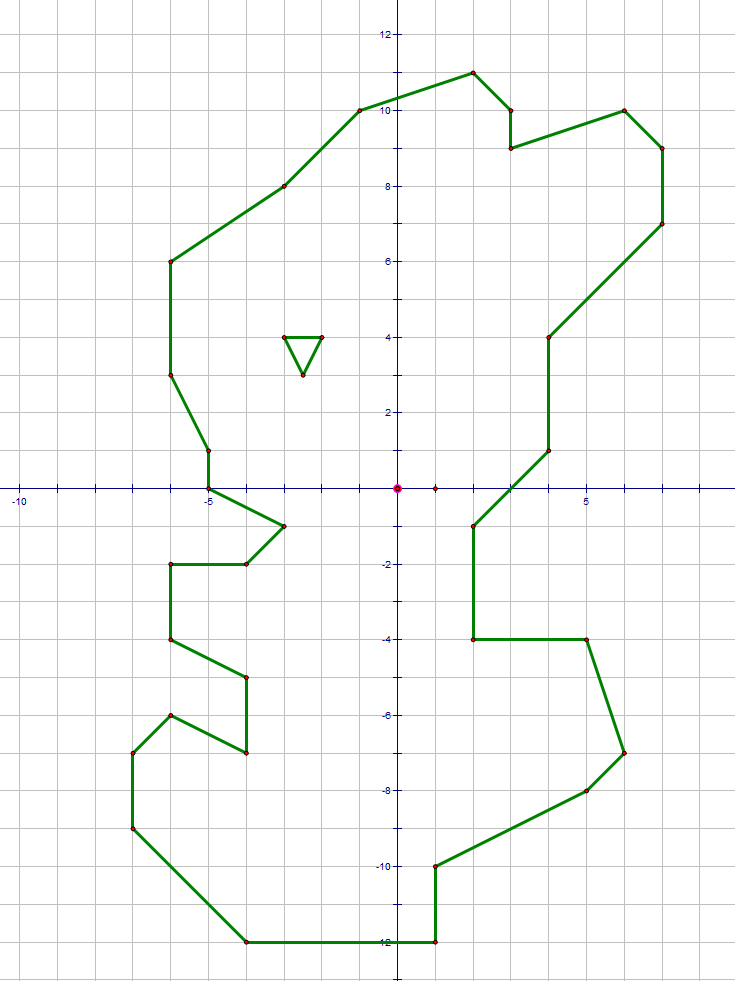 (−5; 1), (−6; 3), (−6; 6), (−3; 8), (−1; 10), (2; 11), (3; 10), (3; 9), (6; 10), (7; 9), (7; 7), (4; 4), (4; 1), (2; −1), (2; −4), (5; −4), (6; −7), (5; −8), (1; −10), (1; −12), (−4; −12), (−7; −9), (−7; −7), (−6; −6), (−4; −7), (−4; −5), (−6; −4), (−6; −2), (−4; −2), (−3; −1), (−5; 0), (−5; 1).