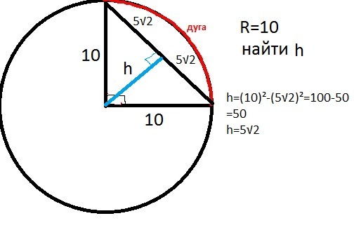 В круге, диаметр которого 20 см, проведены два взаимно перпендикулярных радиуса. Найдите расстояние от центра линии круга до хорды, соединяющего конечные точки радиуса.