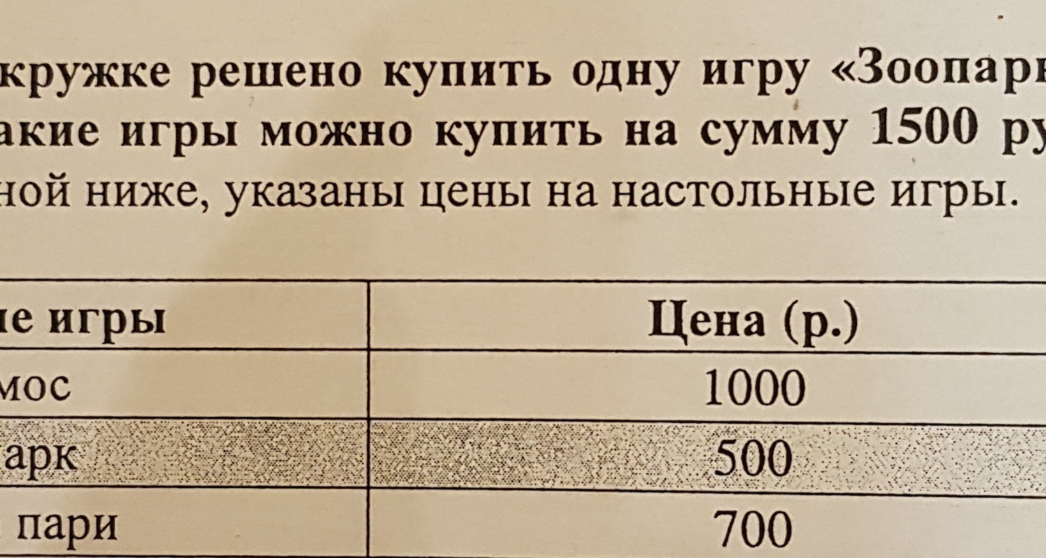 Помогите пожалуйста в решении этой задачи для занятия кружке решено купить одну игру зоопарк и ещё две разные игры какие игры можно купить на сумму 1500 руб в таблице представлены ниже указаны цены настольные игры Космос 1000руб зоопарк 500руб Держи пари 700руб Юный химик 500руб Морской бой 200 эрудит 400руб.Записать нужно два решения этой задачи,чтобы в сумме были три игры на 1500руб.